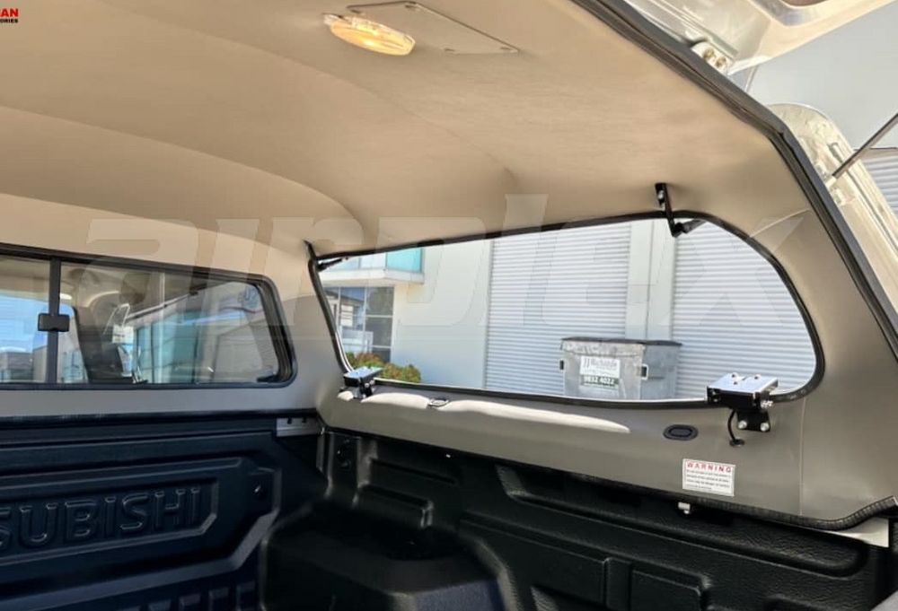 - Tinted lift-up side windows with one-touch release and gas struts.