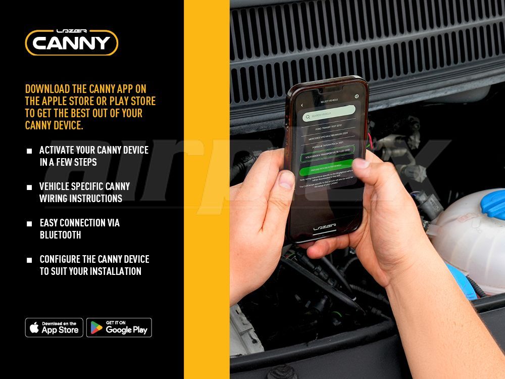 Canny is a CAN interface, developed by Lazer Lamps, that enables installation of auxiliary lights for selected vehicles using CAN communication systems, where it is otherwise not possible to pick-up 12V lighting signals at the back of the vehicle headlamp for example. Comprising a Canny Dongle, plus wiring loom, and supported by a dedicated app (CANNY.LZR), the system benefits from being able to mount within your vehicle’s engine bay for faster and easier installation, or inside the vehicle. Over-the-air Bluetooth synchronisation and updates furthers the systems ease of use and speed of installation.