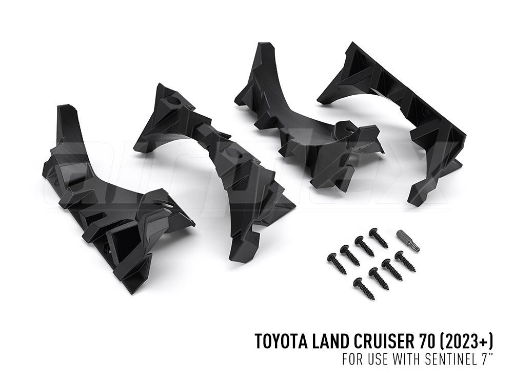 The Toyota LC70 Series (2023+) Grille Integration Kit includes a pair of Sentinel 7” High Performance LED driving lights, supplied with precision-engineered mounting brackets pre-attached to each lamp, alongside a wiring kit and additional fixings to ensure a seamless installation. The brackets fit perfectly within the standard center grille of the LC70 and are secured using the supplied self-tapping plastic screws for enhanced durability and security.