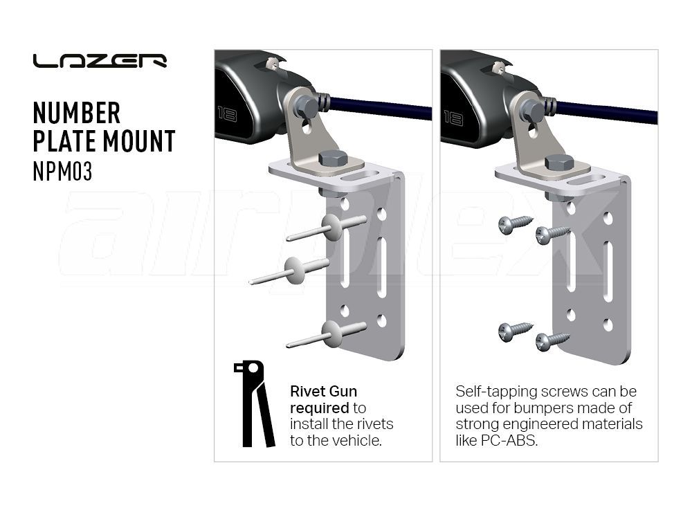 Each kit includes rivets for easy attachment to the vehicle's license plate mount. Drivers must ensure that the lights are securely and robustly fitted to the front of the vehicle. Self-tapping screws can be used for bumpers made of strong engineered materials like PC-ABS; however, for polypropylene bumpers, it is recommended to use the supplied rivets for secure mounting.