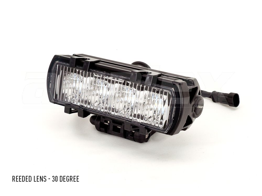Reeded lens for the ST Evolution lights increases the angle of the beam pattern by varying amounts, while also eliminating any potential dark spots when using multiples of lights in combination (dependant on application and setup). The lenses are made from acrylic, and feature a gasket which helps prohibit water and dust getting between the lenses. The reeded lens is secured in place using 4 spring clips supplied with each lens.